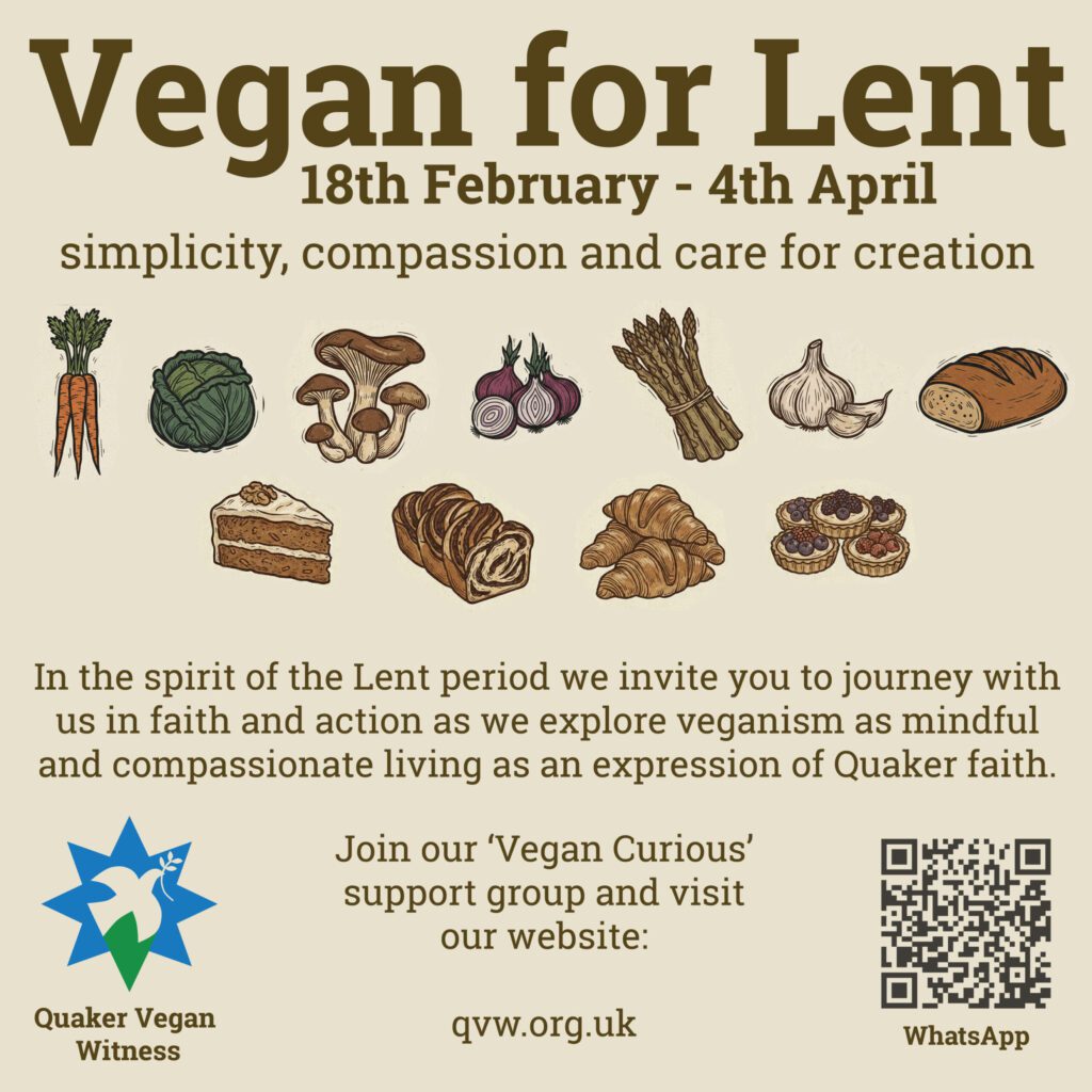 Organised by Quaker Vegan Witness, the initiative encourages Friends to explore vegan living as both a spiritual practice and an expression of faithful witness. Lent offers a natural time for reflection and renewal, and this programme invites participants to consider how everyday food choices can reflect our commitment to peace, equality and stewardship of the Earth.